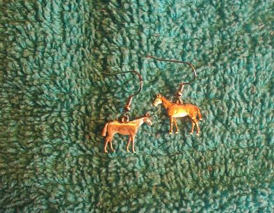 These are cute. I have a pair just like them. The charms were sold to me as "silver overlayed brass". The horse charm is just over 1/2" long and 3/4" tall. These earrings are mounted on silver toned fish hook type earring wires.