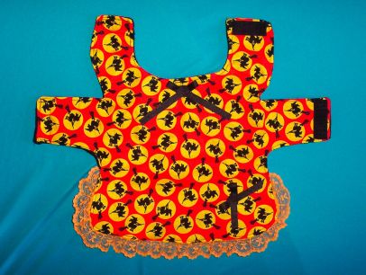 This is a cute little fleece lined Broom Riding Witch Print Dog Coat with two little black bows, one at the neck, one on the hip for a tiny dog. The measurements are, from behind the neck to tail 10 1/4" and the waist will fit a dog with up to a 15 1/4" and is adjustable with velcro . The coat attaches with adjustable velcro. (This coat could also be worn by a rabbit, cat or a large guinea pig.)