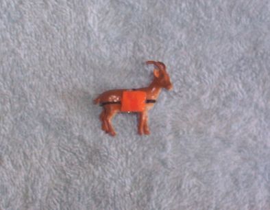 These items are uniquely ours. It is approx 1 1/2"wide and about 2" tall with the horns. The back of this packgoat has a brouche type pin closure. The goat is plastic and the pack is fabric. This little goats pack is orange.