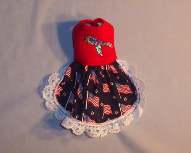 These little dresses are made in a variety of ways. This one is a USA Flags Print trimmed with white lace and has a Red polar fleece top complete with a Cute Sparkling Loop that will remind you of Fireworks.