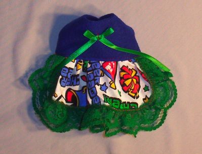 These little dresses are made in a variety of ways. This one is a Cheer Leader Print with a Blue polar fleece top complete with Green Lace Trim lace and Green Bow.
