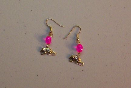 Cute Rattie earrings with pink beads. The charms are approx 1/2" and are hung from gold toned fish hook type earring holder.