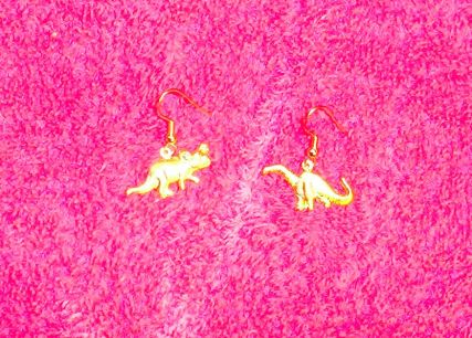 Gold Toned Dinosaur earrings. You will get one Apatosauer/Bonontisaus and one triceratops dinasaur The charms are approx 1" x 1/2" and hang from fish hook type earring holders.